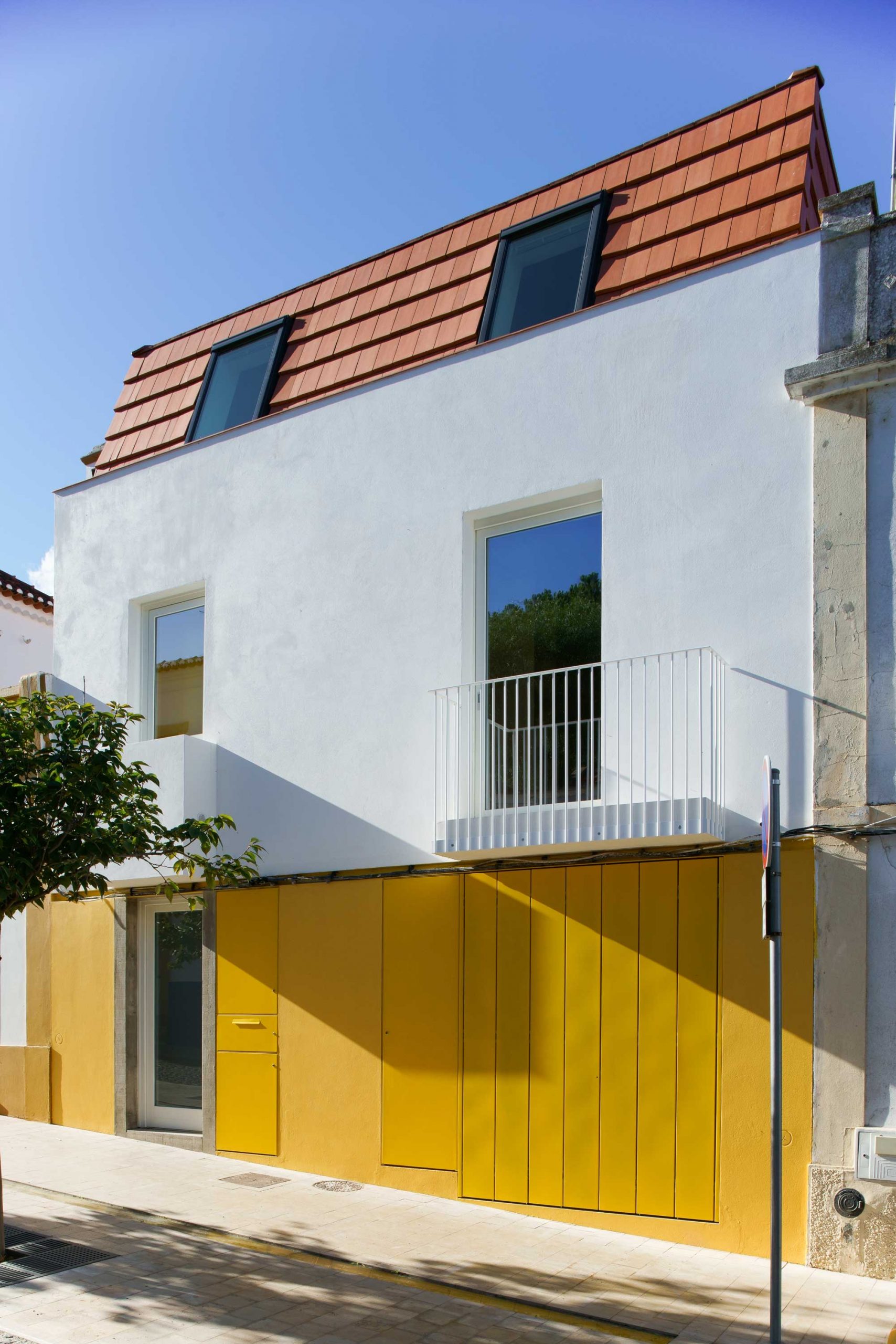 Existindo uma das paredes-meias em alvenaria de pedra em bom estado de conservação, optou-se por preservar essa parede centenária, sendo o único elemento do edifício original que foi mantido. Nos revestimentos exteriores são adotados materiais reconhecidos da arquitetura vernacular, como é o caso da telha cerâmica, das caixilharias de madeira ou dos rebocos à base de cal. Os alçados têm um embasamento mais opaco, sendo ocultado todo o ruído da fachada, tal como caixas técnicas e portão de garagem, e a cor que unifica todo o piso térreo dá a percepção de menor altura da fachada. A volumetria da edificação e os alinhamentos dos topos das fachadas relativamente às edificações adjacentes garantem uma leitura de continuidade do ponto de vista dos arruamentos e da imagem urbana.